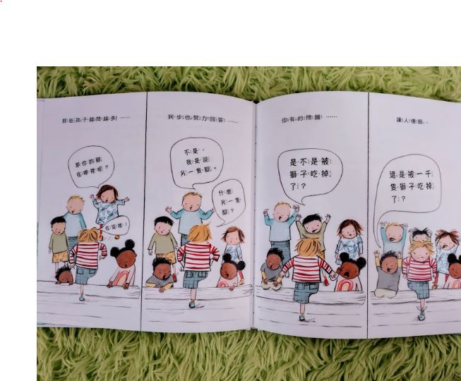 而在《你為什麼只有一隻腳?》這本書中,主角阿步只有一隻腳,在公園玩耍時遇見其他的小朋友好奇詢問,突兀地打斷了他本來樂在其中的遊戲。開始面對眾人詢問:你為什麼只有一隻腳?你的腳被偷走了嗎?那些問題也越來越荒誕離奇,令人哭笑不得。