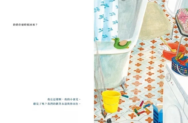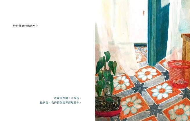 這整個故事從書封、到封底,我們彷彿就像某種電影鏡頭探入,從陽台門邊進入到他們的家,特意將對白都放在空白的一頁,對應著另一頁的圖畫,有種彼此之間的話語都迴盪在空氣中,穿越的時間與空間的限制,穿越了生死的限制,好似我在心裡又或者我憑空地對天呼喚,我所思念的奶奶就能夠回應著我。