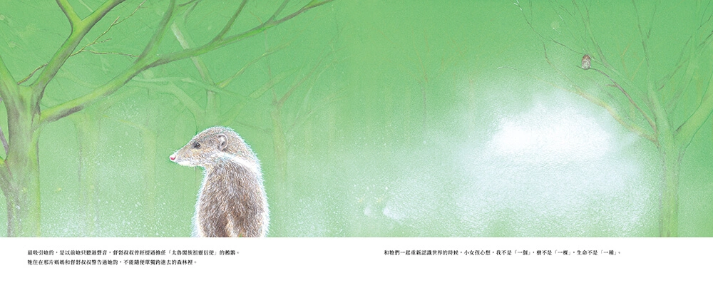 故事告訴我們,女孩是因為咀嚼「巨人之心」,開始聽懂巨人語與動物的心聲,第一次讀這本書時,鮮少研究生態的我一時沒有意會過來,單純認為這是某種魔法,直到後來偶然參加尋找飛鼠的社團,導覽員在介紹時突然傳來一陣蟬鳴,他立刻興奮地告訴大家「這是蟬被鳥抓走時發出的求救聲!」,那一刻我突然驚覺,只要有心,人是能聽懂大自然的低語與號泣,在我耳裡只是再普通不過的蟬鳴,竟是如此有生命力,而了解這股生命力的人們,又是多麽努力在守護環境。