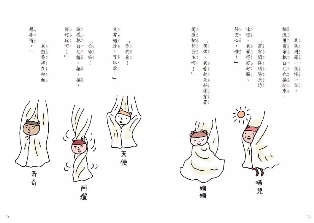 自我介紹才一開始,她腦袋裡的「怎麼辦妖怪」就不斷不斷地跑出來,腦袋一片空白的她不知道該如何是好,最後居然跑到教室角落用窗簾把自己包起來!班上同學好奇點點的舉動,紛紛跟著離開座位跑過去看,出動老師來維持秩序,繼續將自我介紹完成。
