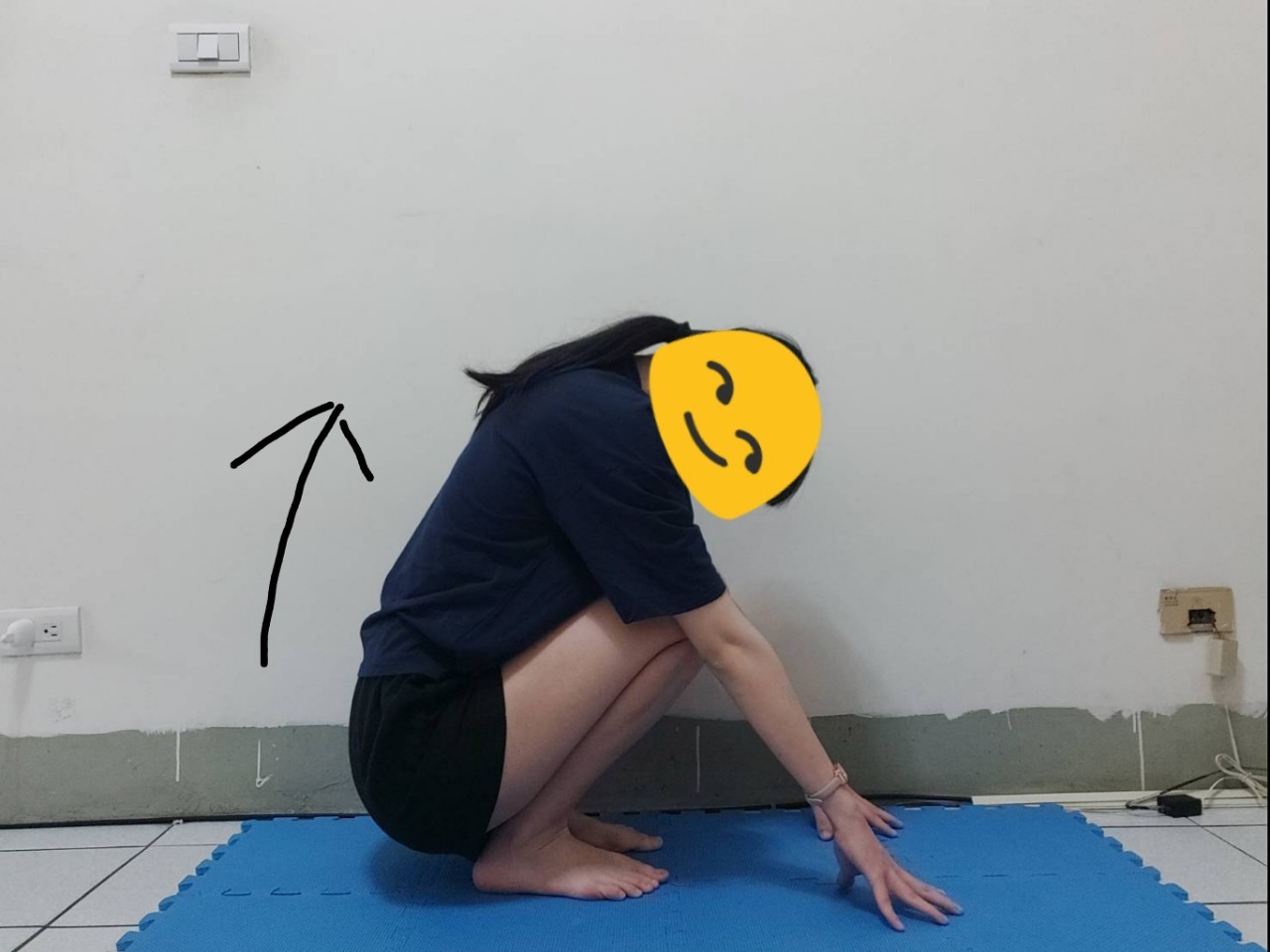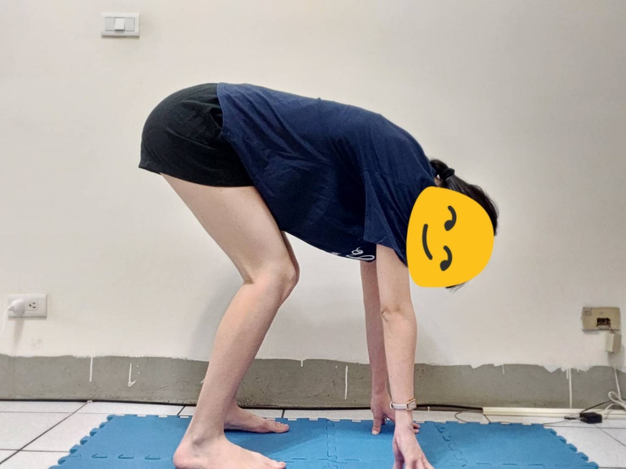 雙腿分開,做蹲姿,胸口在大腿中間。手指尖在前方地面,這個距離完全足夠讓自己伸直雙腿。雙腳跟手指位置不變,慢慢站起身,從蹲姿來到雙腿打直的位置。