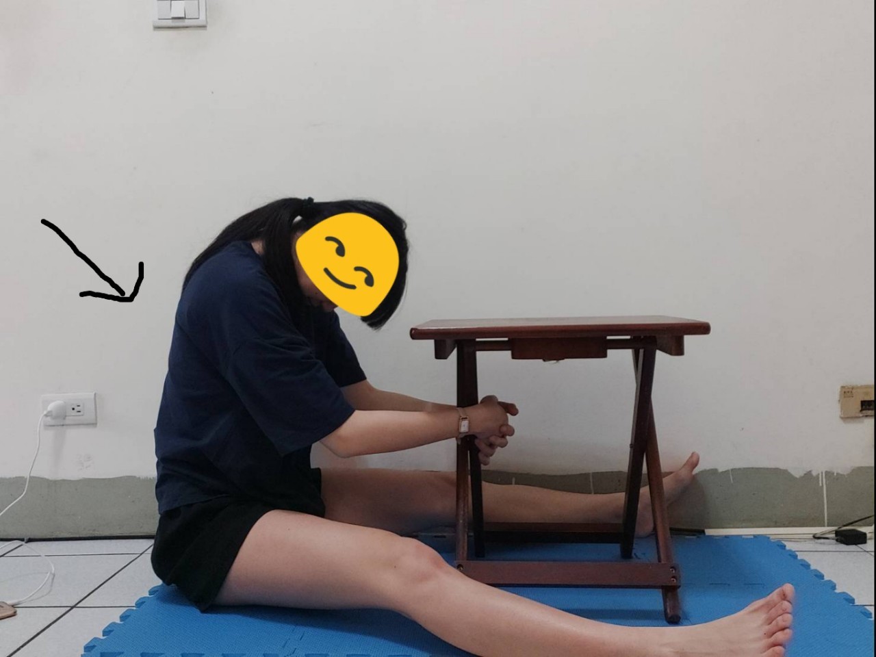 面對你的固定家具,雙腿盡量分開,目標是將上半身盡可能往前伸展。