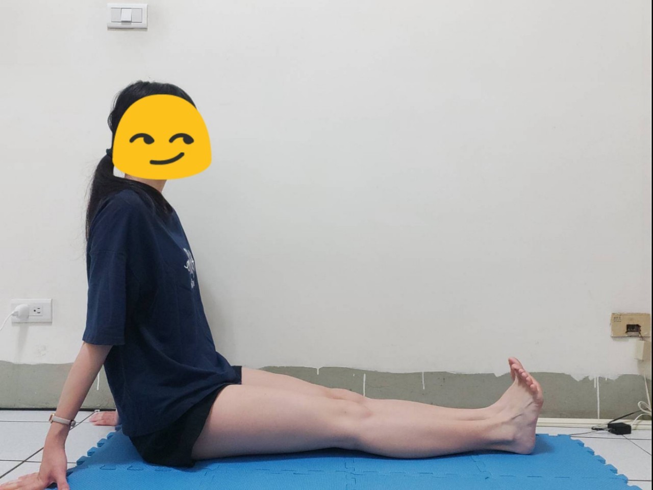 坐在瑜珈墊上,後背伸直,雙腿直直往前,勾腳板。雙手放在身後,手指朝後,膝蓋後側貼向墊子,讓腳跟離地。腳跟離地時雙腿便打直了。