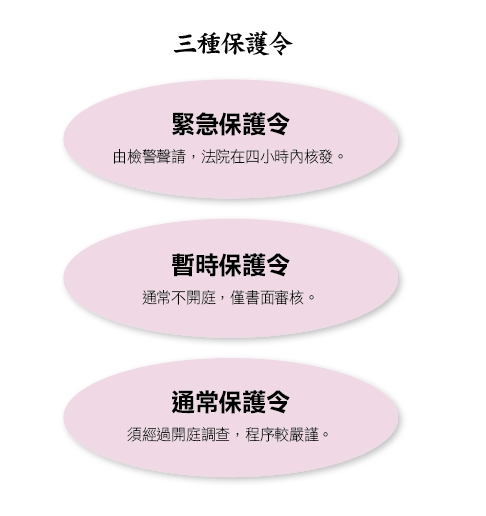 根據《家庭暴力防治法》,保護令分為:緊急保護令、暫時保護令、通常保護令三種。