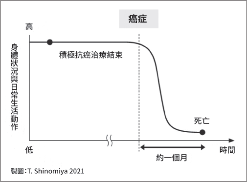請看下一頁的圖,這是癌症患者的身體狀況與日常動作的自然變化。抗癌治療結束後,即使過了一段時間,病患仍可過著相對有活力的生活。但從死前約至兩個月開始,病情就會急速惡化,身體也會以肉眼可見的速度變差。