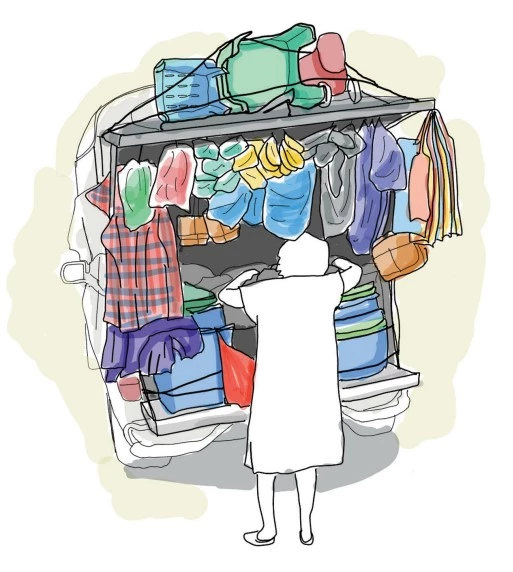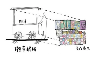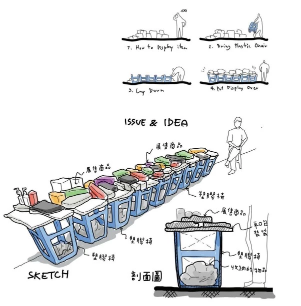 不論是把商品吊或掛在桿子上展示,或是沿著牆面陳列,或是我經常看到利用本就用來收納東西的紙箱、塑膠簍,又或是用塑膠椅或其他方便折疊、收納的東西,來充當產品陳列平台。這樣一來,就不用使用那些搬運麻煩、收納不易的折疊桌。
