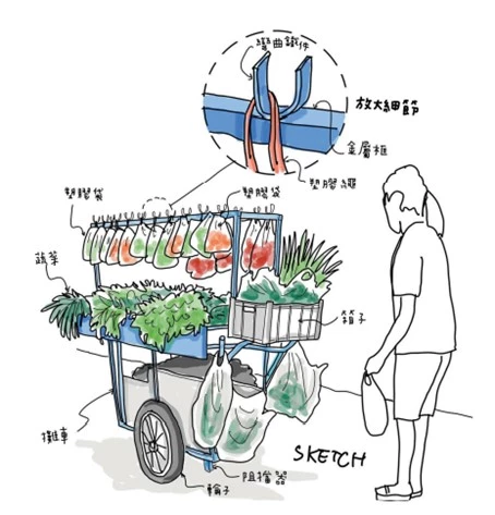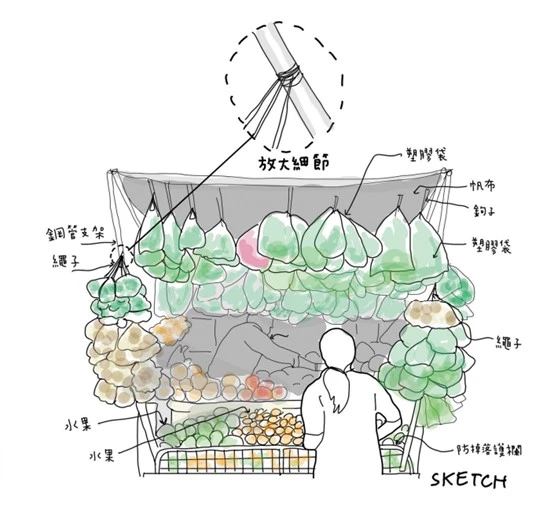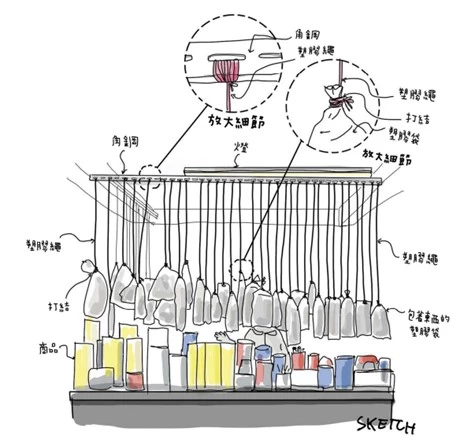 塑膠袋是常見用來裝東西再吊掛販售的工具。雖然看起來不太環保,但它取得容易、價格便宜、尺寸多樣,使用上也沒什麼限制,不論是拿來掛或是堆放都行。這些特性是其他材料難以取代的優勢。