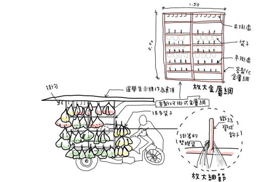 像是下圖,摩托車側邊拖車上,特地設計了垂直排列、多層的金屬掛鉤架。