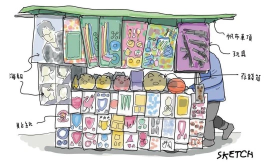 在狹小的販售空間裡,可能只要有一把攤販用來抵擋烈陽的大傘,連擺放商品的桌子都省了。