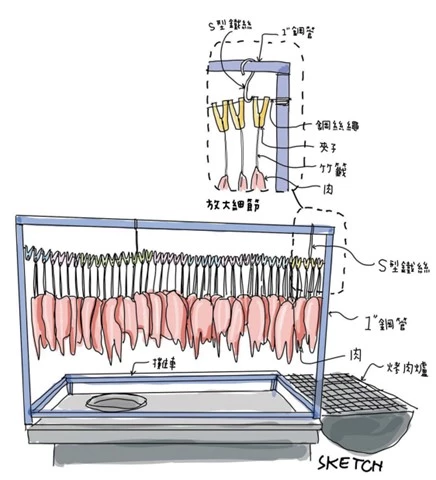 做法是用 PVC 水管綁在鐵網上,把它變成一面可立起來的牆面。再把金屬掛鉤掛在這個牆面上,並用小片的鐵網板安裝在鉤子上,就能變成商品展示架。不僅組裝快速,移動和收納也都很方便。