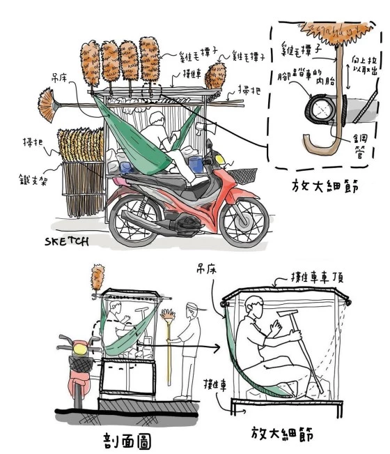 車主選擇將掃把倒插在車頂下展示,並用腳踏車內胎將它和握柄部分固定。這種綁法像是用橡皮筋綁東西的方式,讓掃把無論要取下來賣,或是重新插回去,都非常方便。這種反著插的展示方式,除了從遠處就能一眼看到之外,也不會擋到車上其他販售的商品。