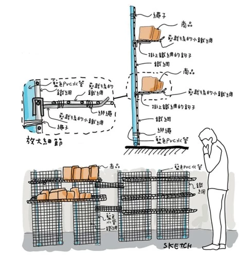有些店家的某些商品類別不適合用掛的,所以店家會自己 DIY 一個展示架。