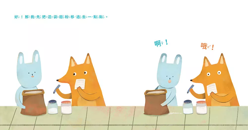 所以兔子和狐狸從麵粉的一點點開始著手,然後衛生紙的一點點,時間的一點點,推算出他們所需要鹽巴的一點點。事情當然是可預期地走鐘到不行,衛生紙的一點點和時間的一點點怎麼比較呢?再推回鹽巴的一點點,那‧‧‧‧‧‧那根本就是一座小鹽山了吧!