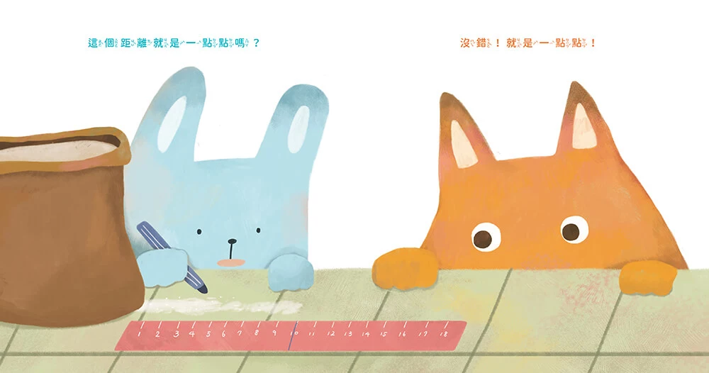 《這可不是一點點》裡的兩位主角,兔子與狐狸,兩個小不點非常認真地討論一點點究竟是多少,從各個不同的角度和想法來回探討,讓我打從心裡佩服他們堅持到底、屹立不搖的精神。