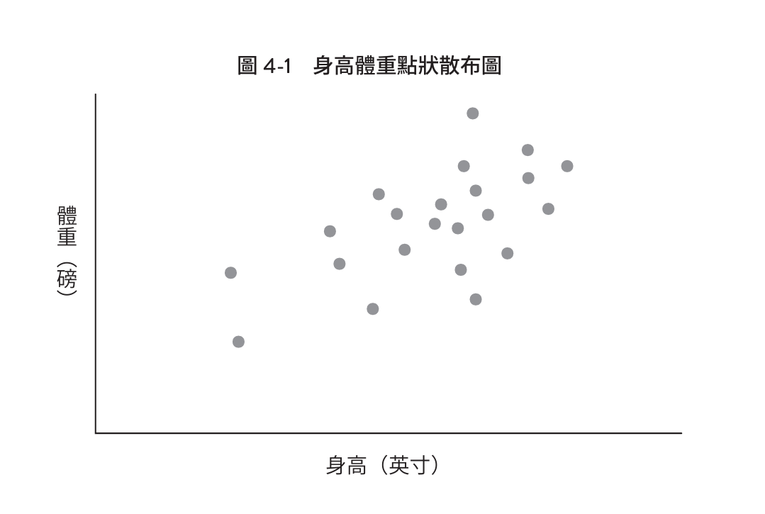 相關係數第二個迷人的特質,是沒有單位的問題。就算身高是用英寸為單位、體重是以磅為單位,我們還是可以計算身高和體重的相關性。相關係數所做的事幾乎可以用神奇稱之:這個統計量把一群用不同單位衡量的大量數據(比方說我們的身高體重點狀圖)合併成一個單一、簡練的描述性統計。