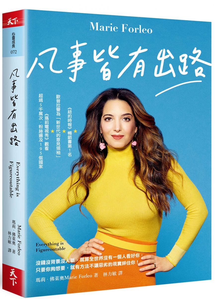 所以千萬不要妄自菲薄,請容我再提醒你一次───凡事皆有出路,這句話同時也是瑪莉.佛萊奧的座右銘。瑪莉是誰?她在生涯教練這行業剛出現時,就毅然決然地投入這未知的領域,並從簡陋的設備開始拍攝勵志影片,也就是現在觀看次數超過五千萬次的《瑪莉電視秀》。她的電視秀激勵許多迷惘的靈魂,許多觀眾被她的話語救贖,大家會如此信任她,不單只是靠著她生動有趣的演說,深入了解瑪莉的故事後,你會發現,她是身體力行地在執行信念能實現夢想這件事。