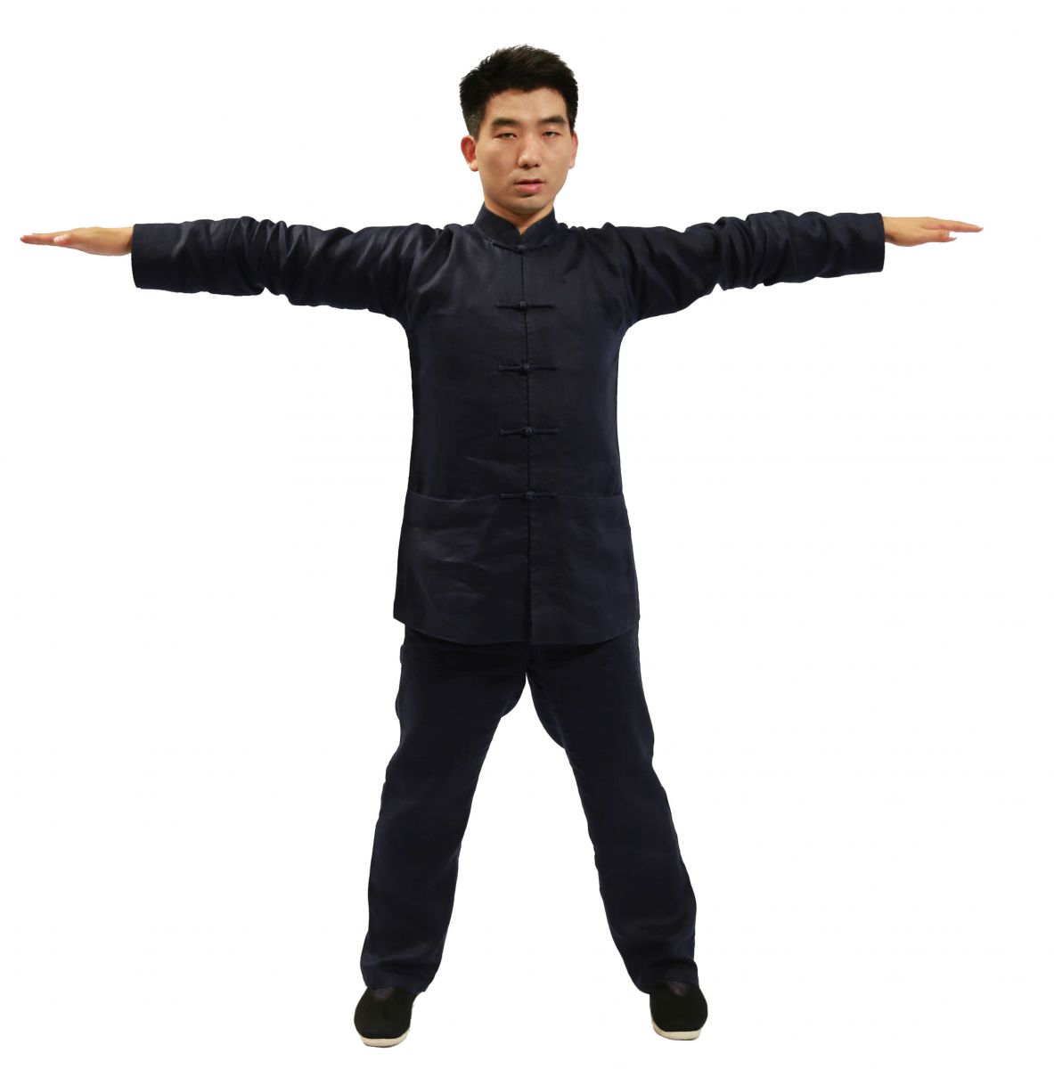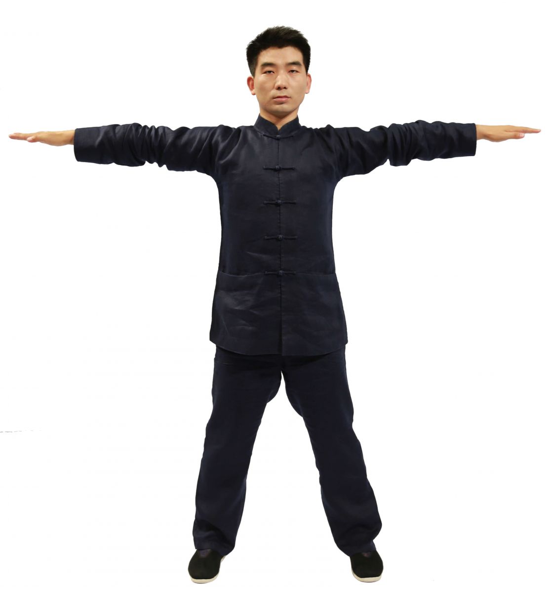 1. 自然站立,手部中指帶動兩臂向身體兩側平舉。