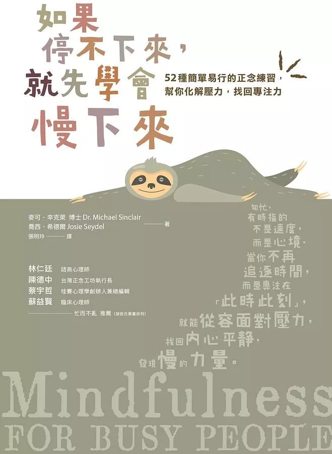 《如果停不下來,就先學會慢下來》書中提到「正念減壓」的創辦人Jon Kabat-Zinn曾於美國麻州大學成立「減壓門診」,實施正念減壓療法(Mindfulness-Based Stree Reduction,英文簡稱MBSR)用以幫助人們舒緩壓力、焦慮、疼痛及疾病。聽起來或許會覺得不可思議,但跟著書中的正念指引做了一個月多,奇妙地覺得生活中有時突然湧現的平靜感會帶給我抽離事事或與萬事萬物融合的感受。