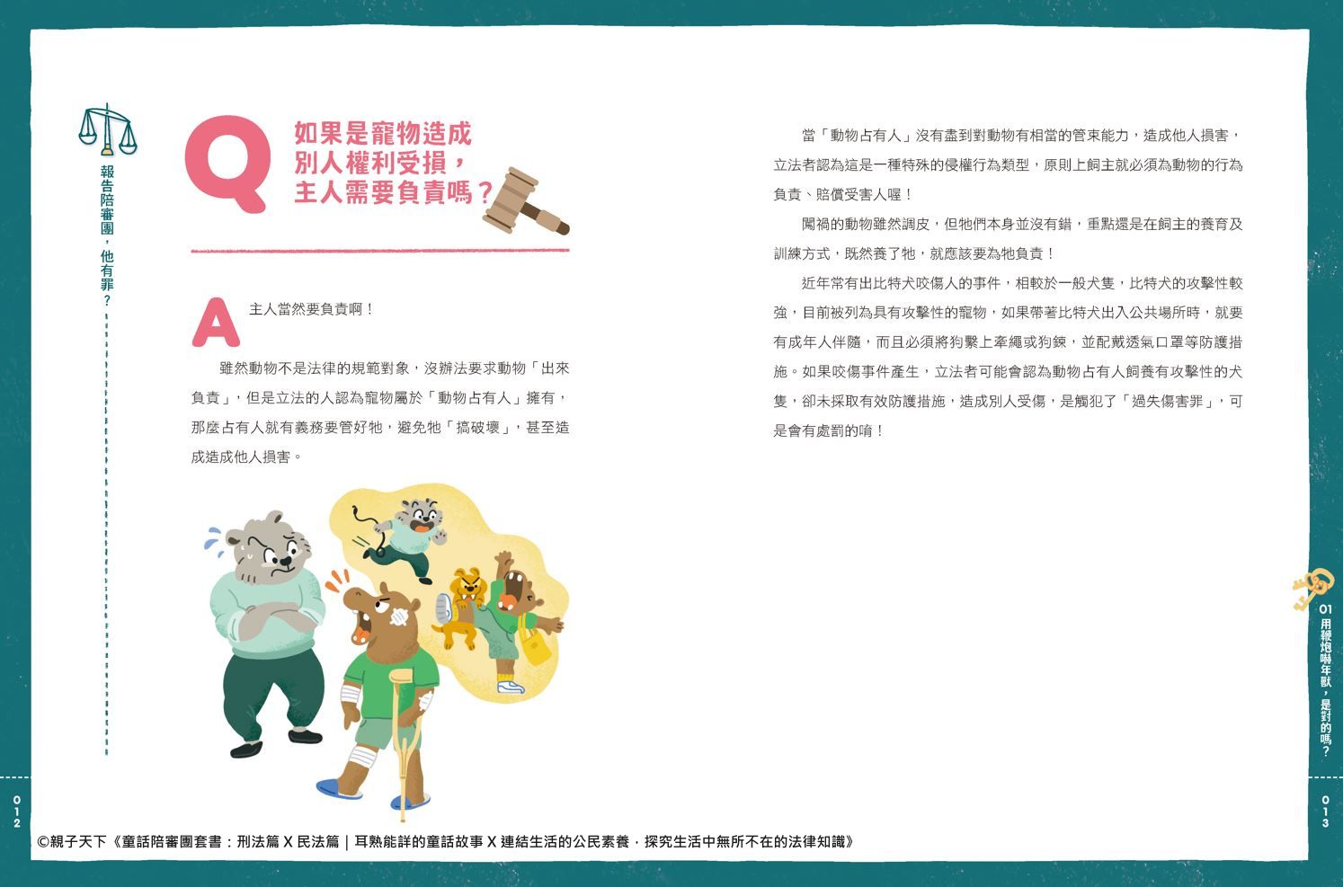 除了針對童話故事做法律層面的理解和澄清外,每個故事之後還有一篇Q&A,提出貼近生活的問題,讓主題更深入、更貼近日常。虎姑婆裡的小兄妹將虎姑婆殺死後,Q&A問到:「正當防衛」和「防衛過當」的差別在哪裡?到底該怎麼分辨啊?解釋的過程中,加入實際發生過的判例:丈夫為了保護懷孕的妻子,失手打死了侵入房子偷竊的小偷,實務上如何判決﹖實例讓Q&A問答變得更具象,增添生動的閱讀感受;在民法篇中,買賣、財產、婚姻、親權等等,案例更是隨手可得,新聞媒體上幾乎天天可見。《童話陪審團》收錄了最新的判例和大法官解釋,像是亞洲第一個通過同性婚姻的國家就是臺灣,也提到過去曾經影響台灣法界的歷史事件,如戒嚴時期「424刺蔣案」原委。孩子透過閱讀和理解法律的基本精神和要義,對於曾經發生或正在發生的辯論和事件,或許可以擴展一些思考空間,更能表達自己的看法。