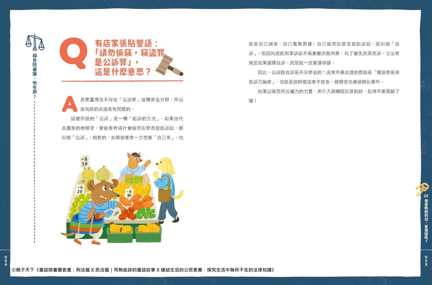 法律白話文運動是一個致力於向民眾推廣法律理解的新媒體,由一群志同道合的法律人所組成,在Podcast、網路平台、甚至某些公共電視的節目裡都可以看得到他們的身影。這一次,他們將法律知識拓展至孩子的世界裡,透過《童話陪審團》刑法篇與民法篇兩冊,共計四十個童話故事展演發生在生活中大大小小的法律事務,以簡單易懂的角度切入,向孩子介紹台灣現行的法律條文和規範,並舉出實例加以說明。