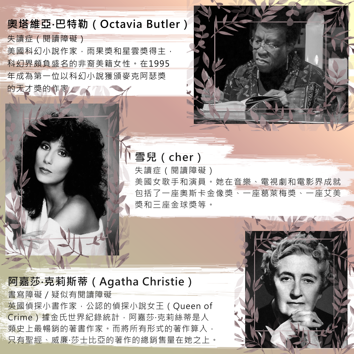 我們可以在愛因斯坦、史蒂芬‧史匹柏、雪兒(Cher)、奧塔維亞‧巴特勒(Octavia Butler)、愛迪生……,安迪沃荷(Andy Warhol)和阿嘉莎‧克莉斯蒂(Agatha Christie)等人身上,看見讀寫障礙人士的創意。