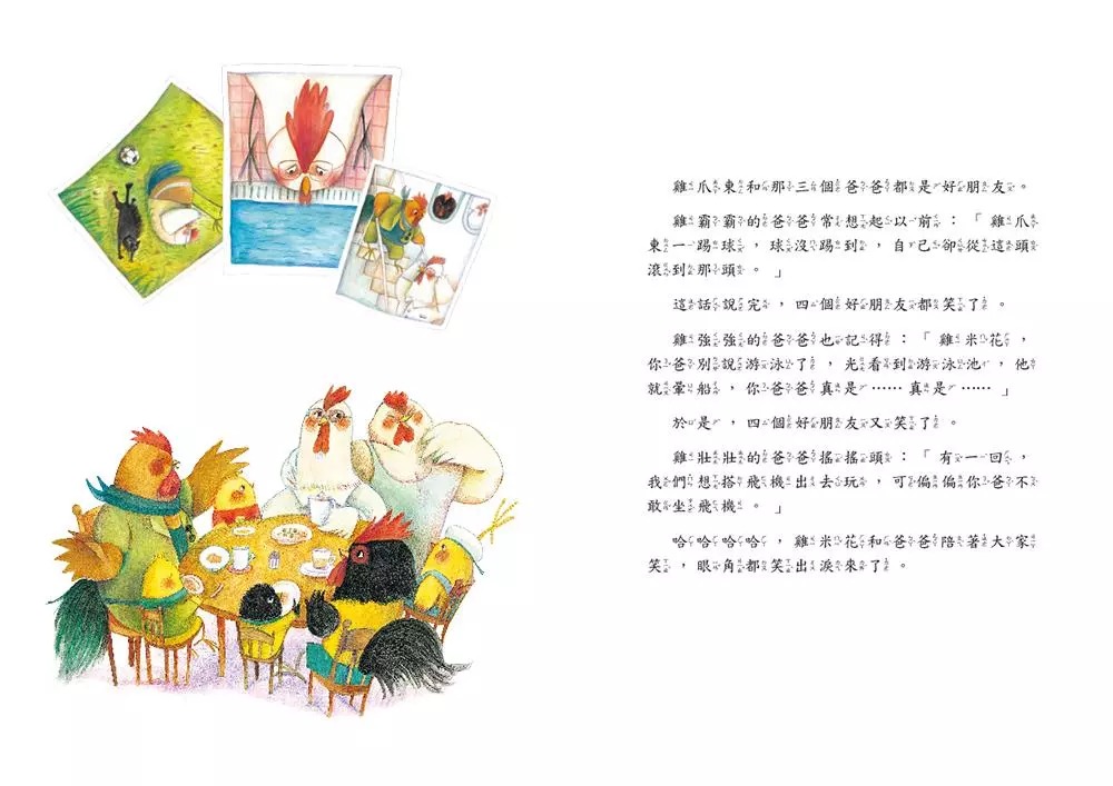 雞霸霸的爸爸會踢球,雞強強的爸爸愛游泳,雞壯壯的爸爸擅長開飛機,雞米花的爸爸雞爪東和他們是好朋友,可是什麼也不會,只會做娃娃。這天離開餐廳的時候,大家的笑聲還在耳朵邊迴盪,雞米花和爸爸頭低低的什麼也沒說,只是慢慢走回家。